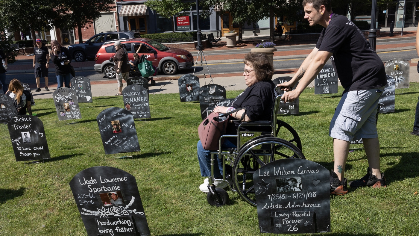 Ein öffentliches Kunstdenkmalprojekt ehrt im August 2023 die Opfer der Opioidkrise in Binghamton, New York. Gelder aus Opioid-Rechtsstreitbeilegungen fließen nun an Bundesstaaten und Kommunen, aber die Abrechnung ist uneinheitlich.