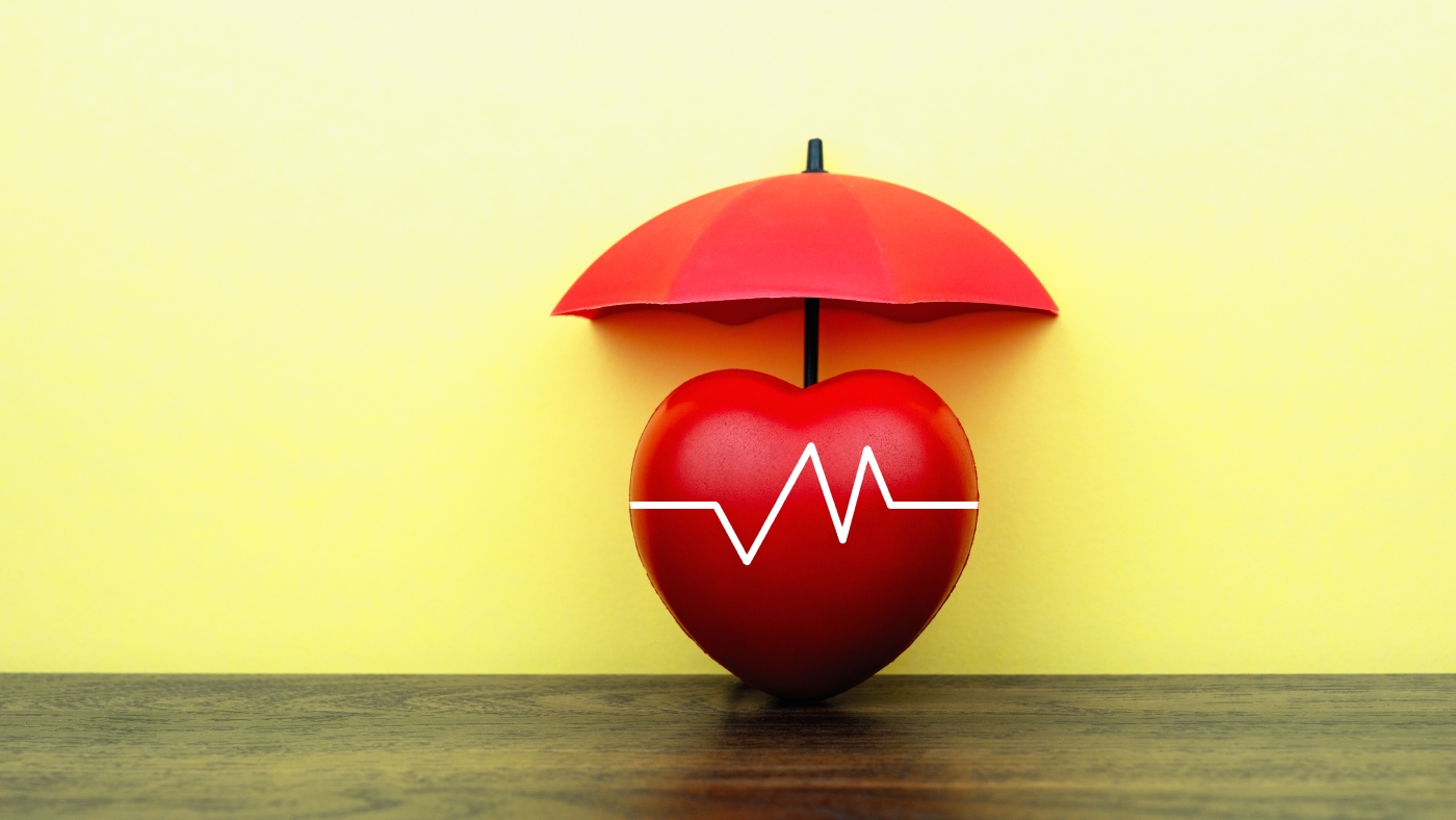 Eine Fotoillustration zeigt einen Apfel mit einer EKG-Linie darüber, bedeckt von einem Regenschirm.