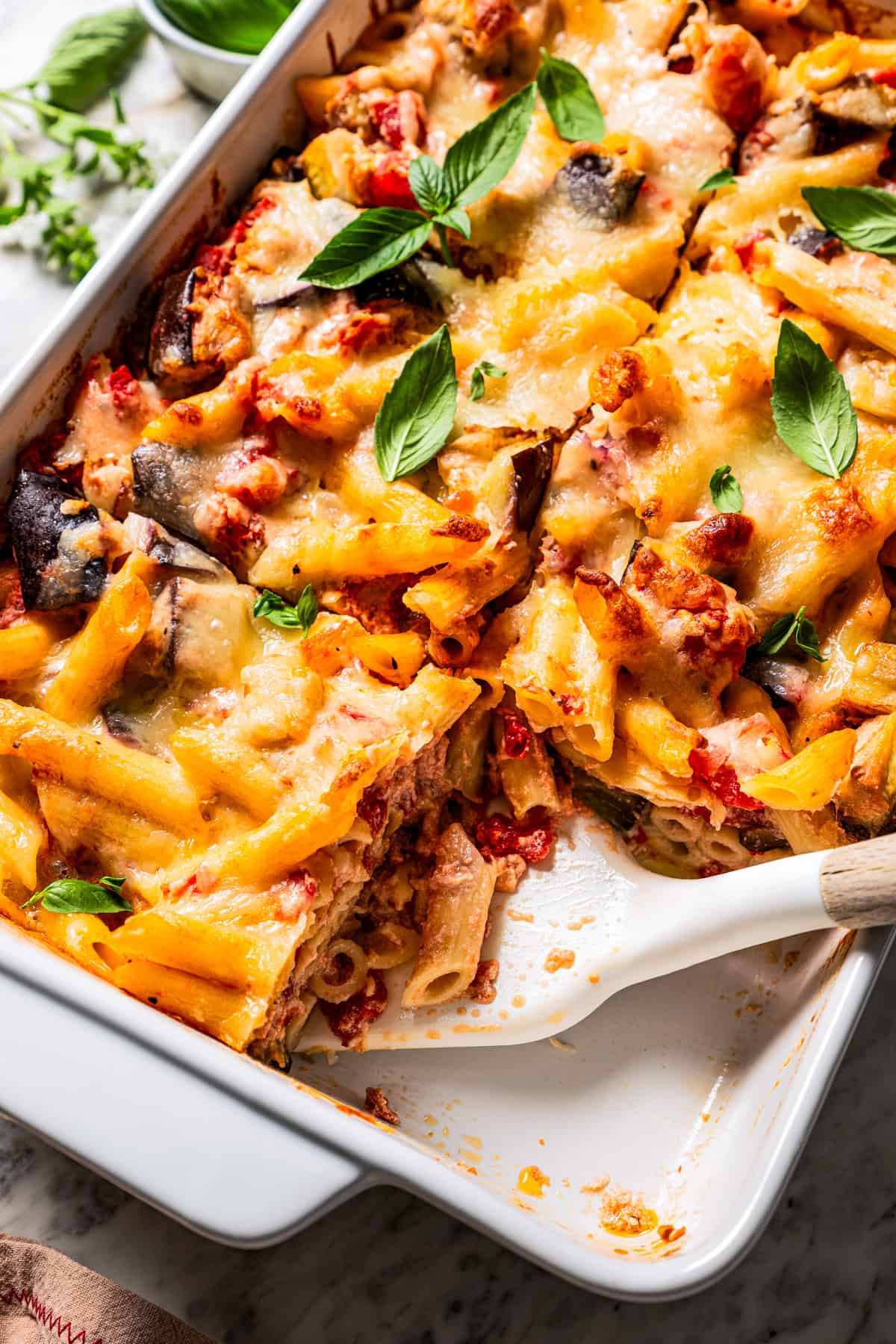 Das gebackene Auberginennudeln ist ein einfaches Abendessen unter der Woche mit zarten Auberginenstücken und Penne-Nudeln mit saftigen Tomaten und geschmolzenem Ricotta und Mozzarella. Alles wird heiß und sprudelnd in einer Auflaufform gebacken!