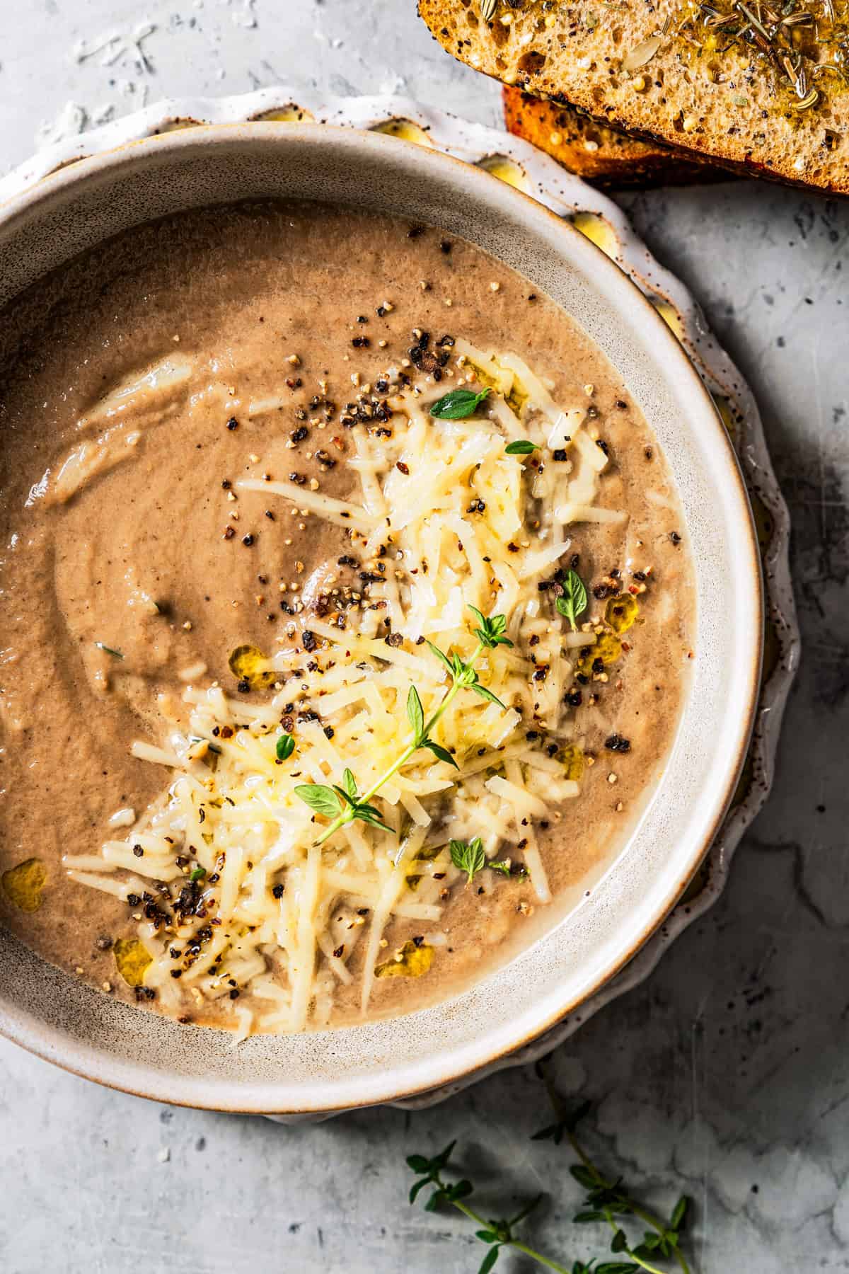 Noch so cremig cremige Pilzsuppe ist ein einfaches Rezept, gefüllt mit süßen und erdigen gerösteten Pilzen, Zwiebeln, herzhaften Kräutern und Parmesankäse. Es hat die seidigste Textur und ist in weniger als einer Stunde fertig!