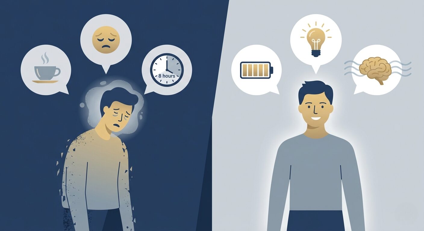 Sieben Stunden. Manchmal acht. Den Zahlen nach machen Sie das Richtige. Aber der Morgen kommt und es fühlt sich an, als wäre die Nacht kaum passiert – neblig, schwer, als hätte Ihr Gehirn ein Nickerchen gemacht, als es einen vollständigen Systemneustart brauchte. Kaffee macht funktionsfähig. Am Nachmittag verblassen Sie wieder. Und egal wie früh Sie zu Bett gehen, das Muster wiederholt sich.