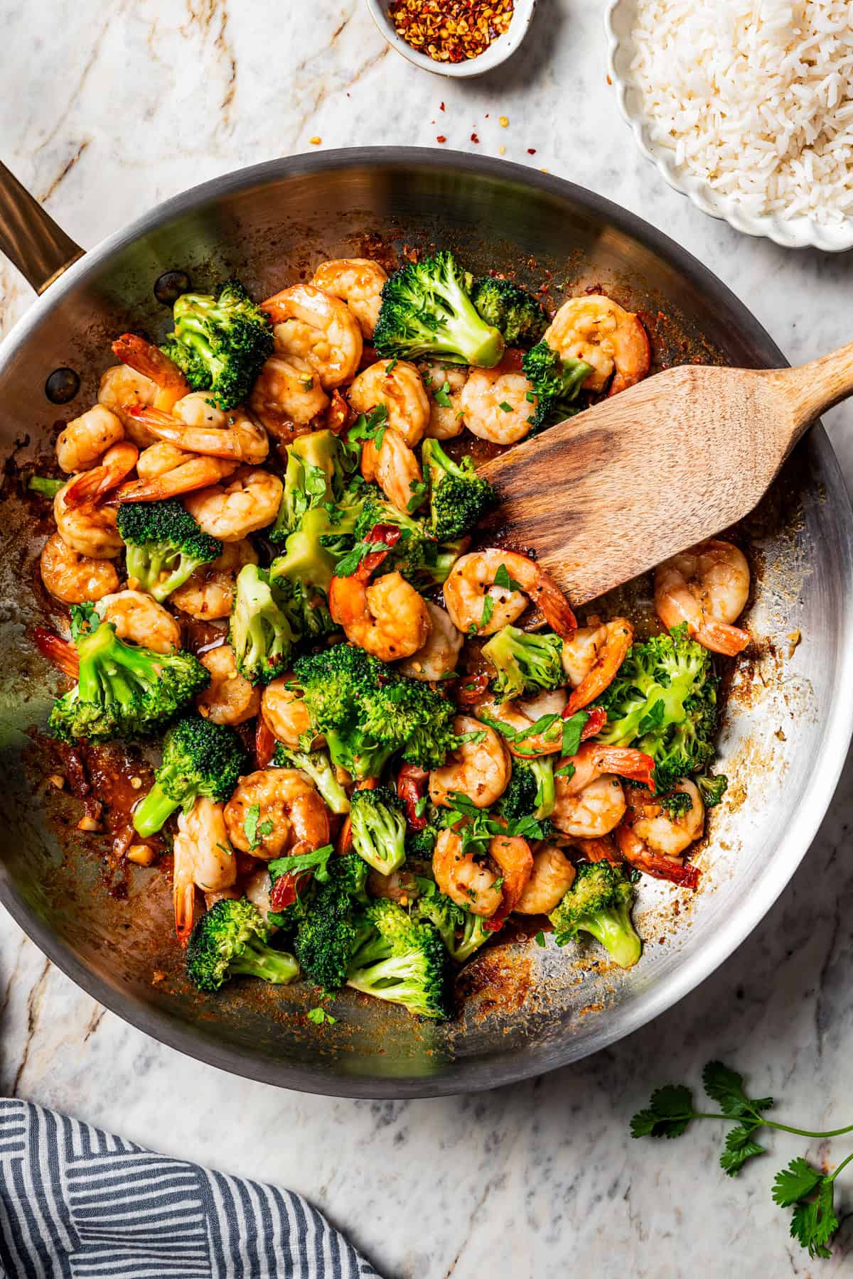 Ich liebe das leuchtende Grün und das zarte Knuspern der Brokkoliröschen in dieser Garnelenpfanne, aber das bedeutet nicht, dass Sie nicht Ihr Lieblingsgemüse eintauschen können! Zu den guten Gemüsesorten zum Braten gehören neben Brokkoli auch Zwiebeln, Karotten, PilzeBrunnenkresse, Zuckererbsenund Paprika, oder Sie können ein gefrorenes Gemüsegemisch verwenden. Um dieses Rezept unter 30 Minuten zu halten, bleiben Sie bei schnell kochendem Gemüse.