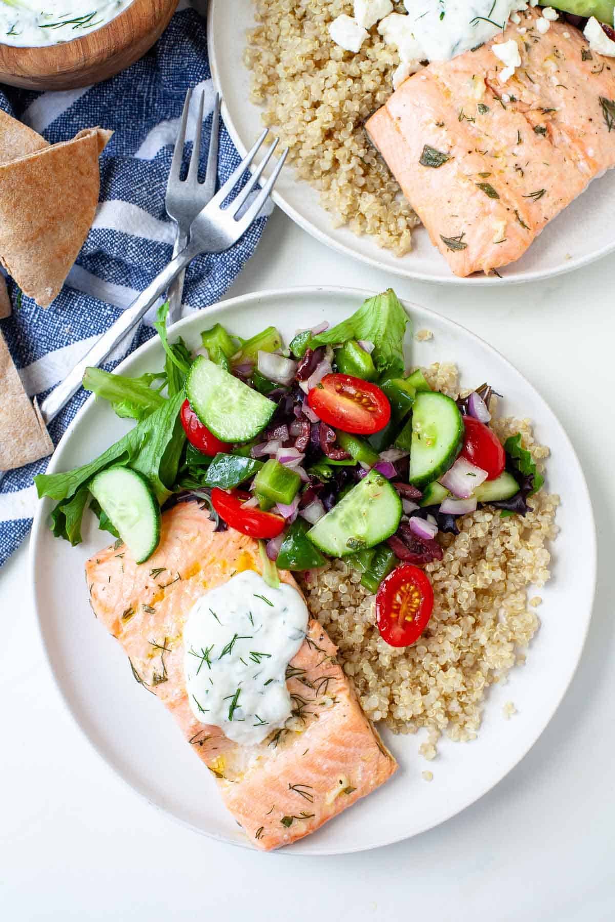 - Zur Essensvorbereitung: Quinoa kochen, Tzatziki zubereiten und Tomatensalat im Voraus anrichten. Sie können Lachs auch einen Tag im Voraus zubereiten. Am Abend des Essens einfach die Schalen anrichten!