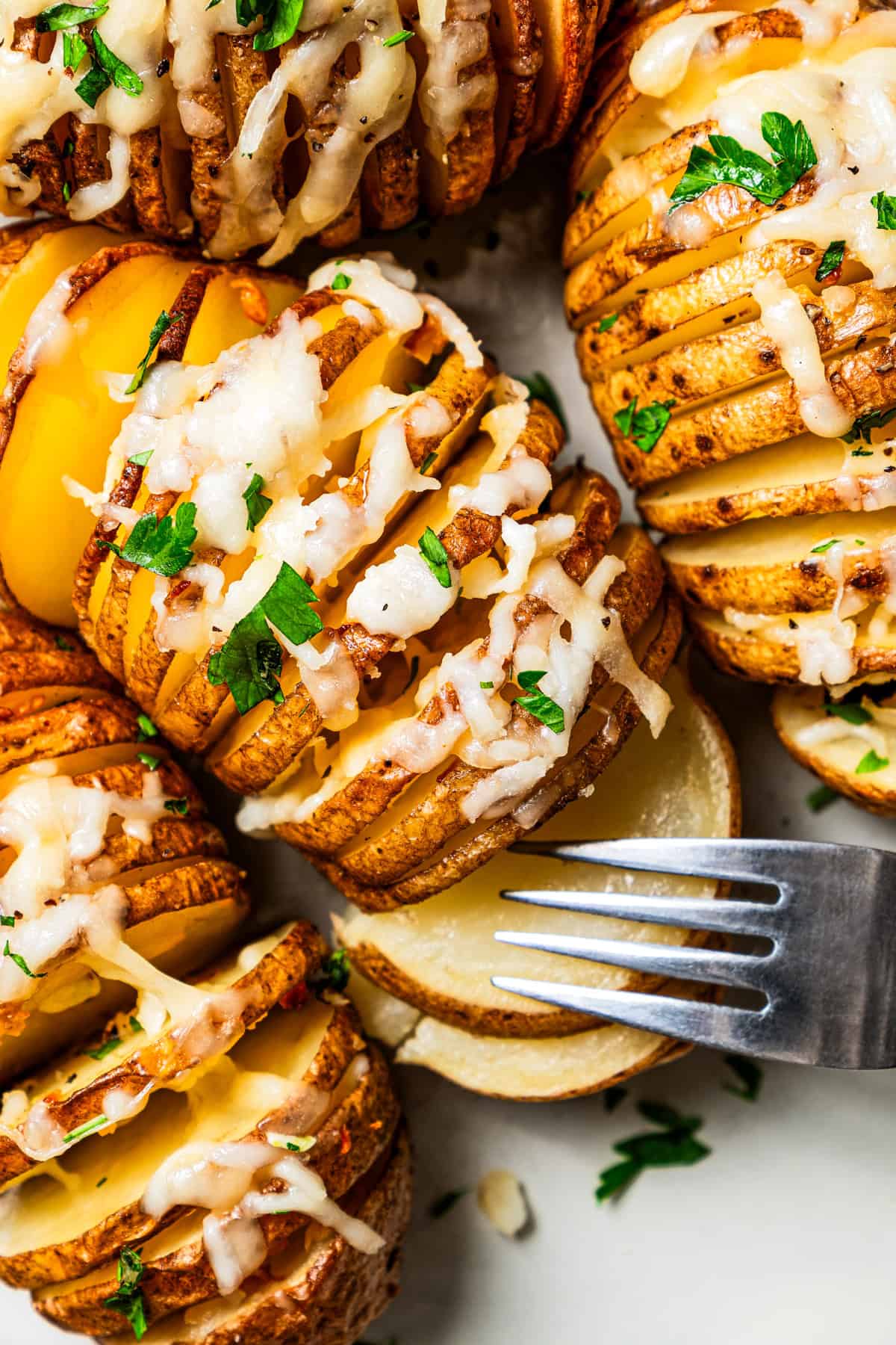 Hasselback-Kartoffeln sind die beste Beilage! Servieren Sie sie mit geschmorte Lammkeulen an den Feiertagen mit festlicheren Beilagen wie Füllung Und grüne Bohnen im Speckmantel. Zu jeder anderen Jahreszeit werde ich nie auf eine Hasselback-Kartoffel als Beilage verzichten BBQ-Rippchen oder im Ofen gegrilltes Steakmit einem familiären Stil Cobb-Salat zum Teilen.