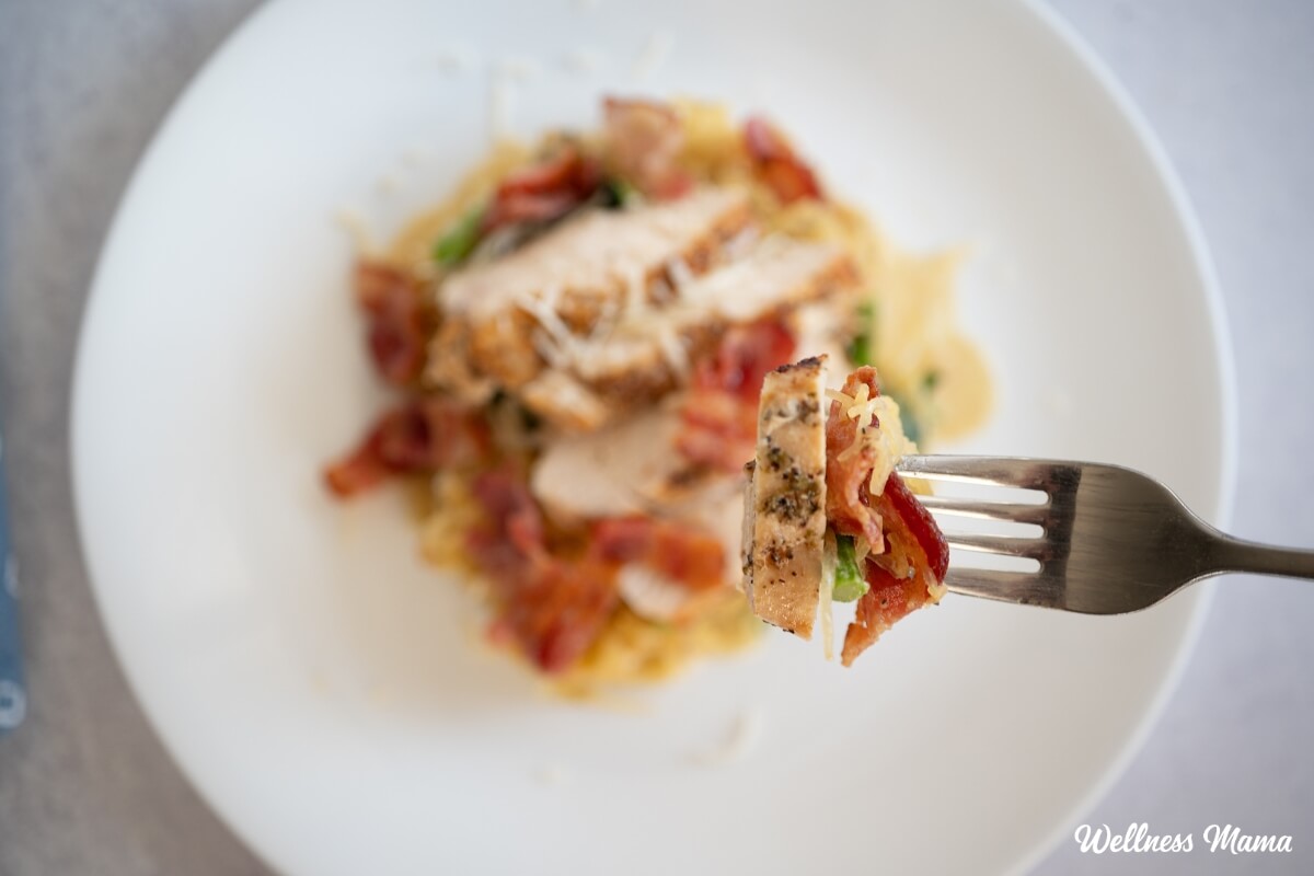 Ich habe die Nudeln durch Spaghettikürbis ersetzt, um eine getreidefreie Model zu erhalten. Ich habe auch eine gesündere (und optionale) Carbonara-Sauce gemacht und etwas welken Spinat und Spargel für Geschmack und zusätzliche Nährstoffe hinzugefügt. Anstelle von Pancetta, der schwer zu finden sein kann, wird in diesem Rezept knuspriger Speck verwendet.