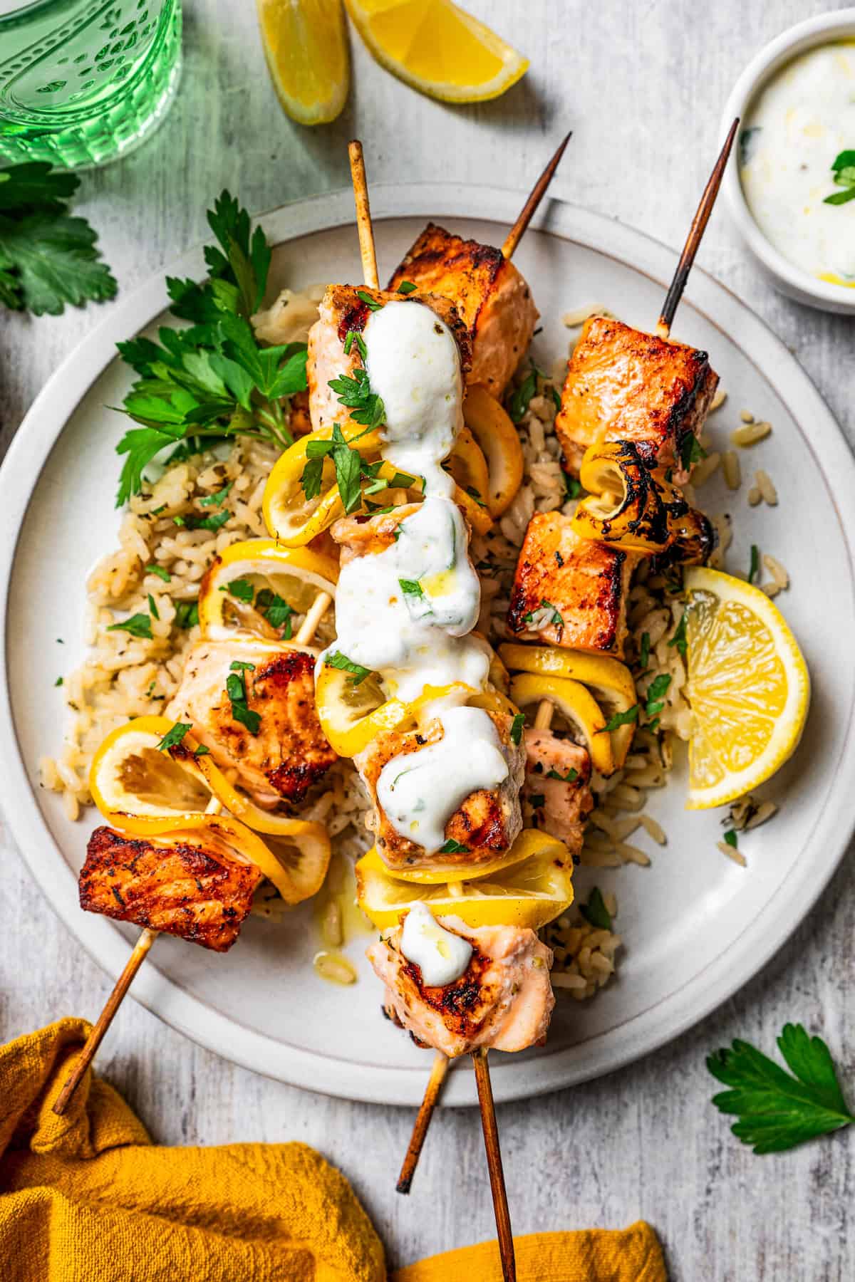 Diese Knoblauchjoghurtsauce ist eine Explosion aus der Vergangenheit. Meine Schwester und ich haben unsere getaucht Pommes frites darin, als wir klein waren. Schneller Vorlauf, und es schmeckt köstlich auf diese Lachs Kabobs! Um es zu schaffen, kombinieren Sie einfach frisch gehackten Knoblauch mit einfachem (oder griechischem) Joghurt, Olivenöl, gehackter Petersilie und Salz. Es ist perfekt für Fisch, Hühnchen, Lamm und Gemüse. Alles geht!