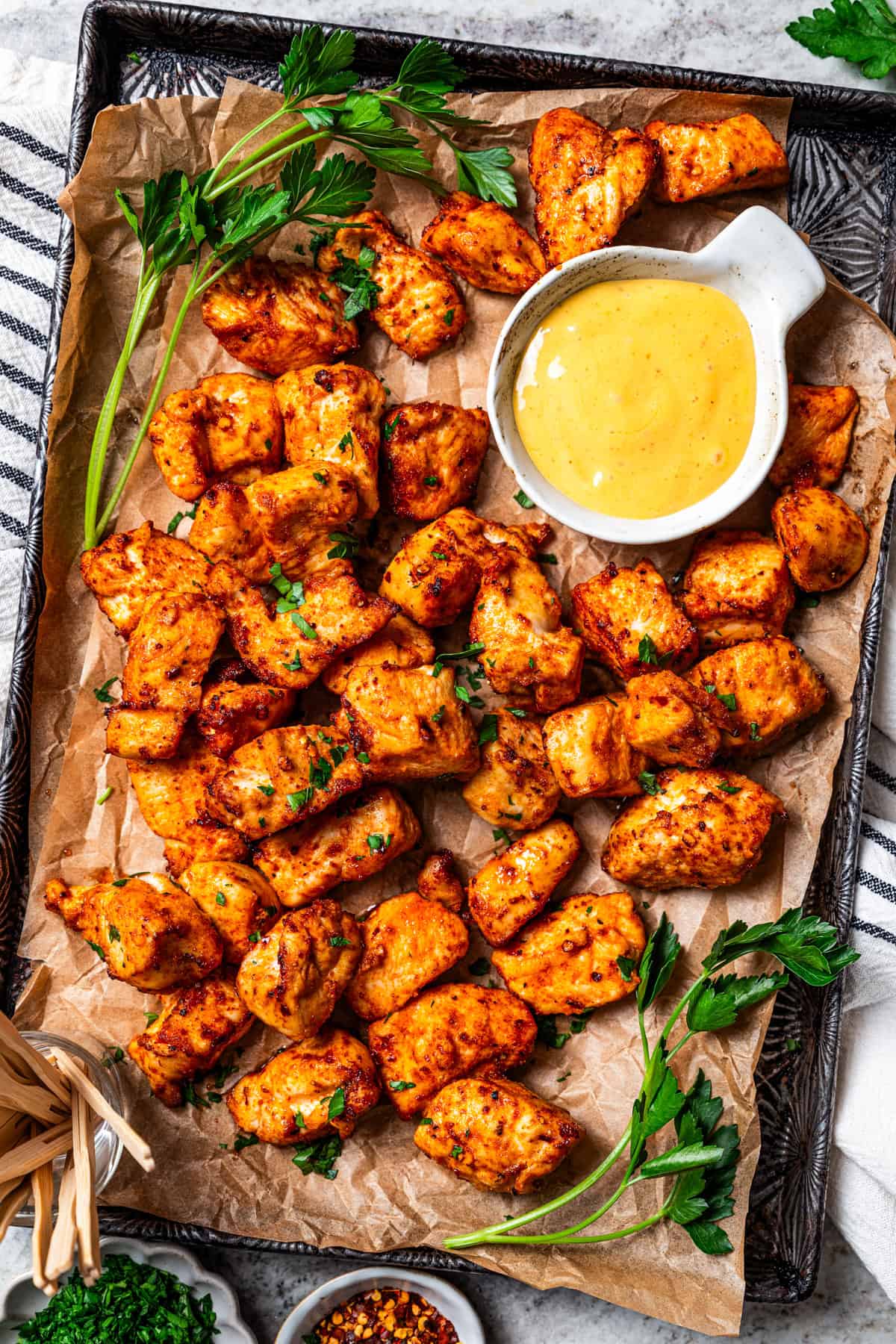Servieren Sie diese saftigen, gewürzten Luftbraten -Hühnchenbissen als Mahlzeit oder Vorspeise mit Ihren Lieblings -Dip -Saucen, wie Honigsenf oder Grillsauce.