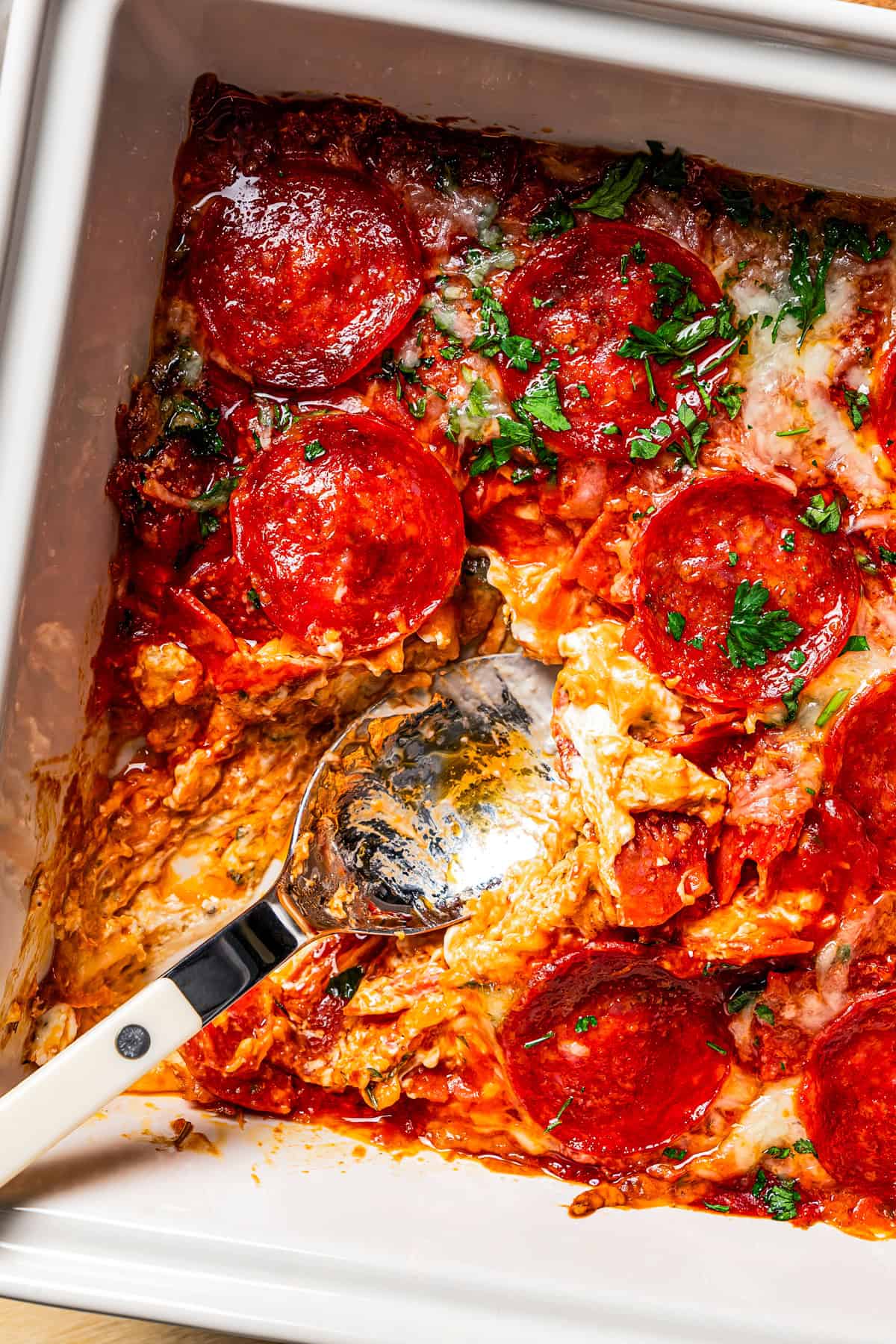 - Pizzabelag – Ich fülle diesen Peperoni-Pizza-Dip quick immer mit gehackten Peperoni und frischer Petersilie. Quick alle Beläge, die Sie zu einer Pizza hinzufügen würden, können Sie zu diesem Dip hinzufügen. Weitere Ideen finden Sie weiter unten!