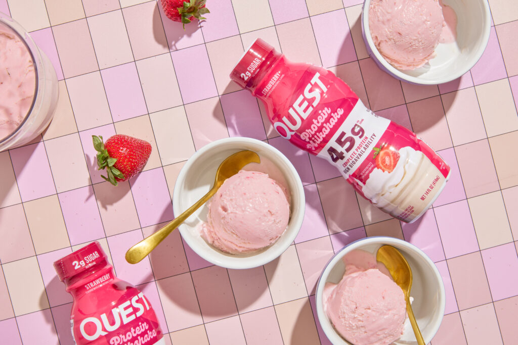 - Entfernen Sie das Pint, fügen Sie die weitere halbe Tasse von hinzu Quest -Erdbeer -Proteinmilchshake und drücken Sie eine erneute Spin. Genießen.