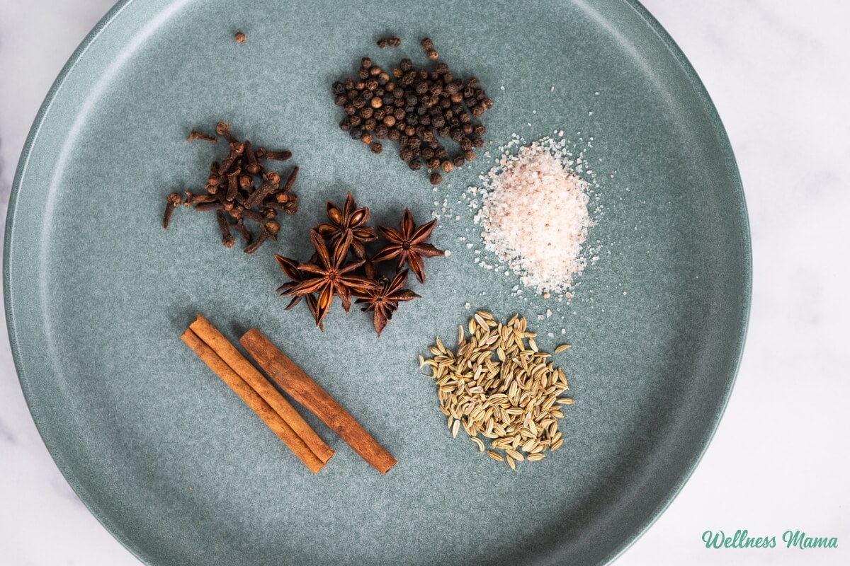 Die Kerngewürze, die üblicherweise verwendet werden, sind Stern AnisSichuan-Pfefferkörner (oder schwarzer Pfeffer), Fenchelund Cassia oder Chinesische Zimt. Andere Gewürze wie Sand Ingwer, Nelken, KurkumaLakritze, Fenchelsamen oder Zitrusschalen werden ebenfalls hinzugefügt. Es ist ähnlich wie Garam Masala mit seinen wärmenden Gewürzen.