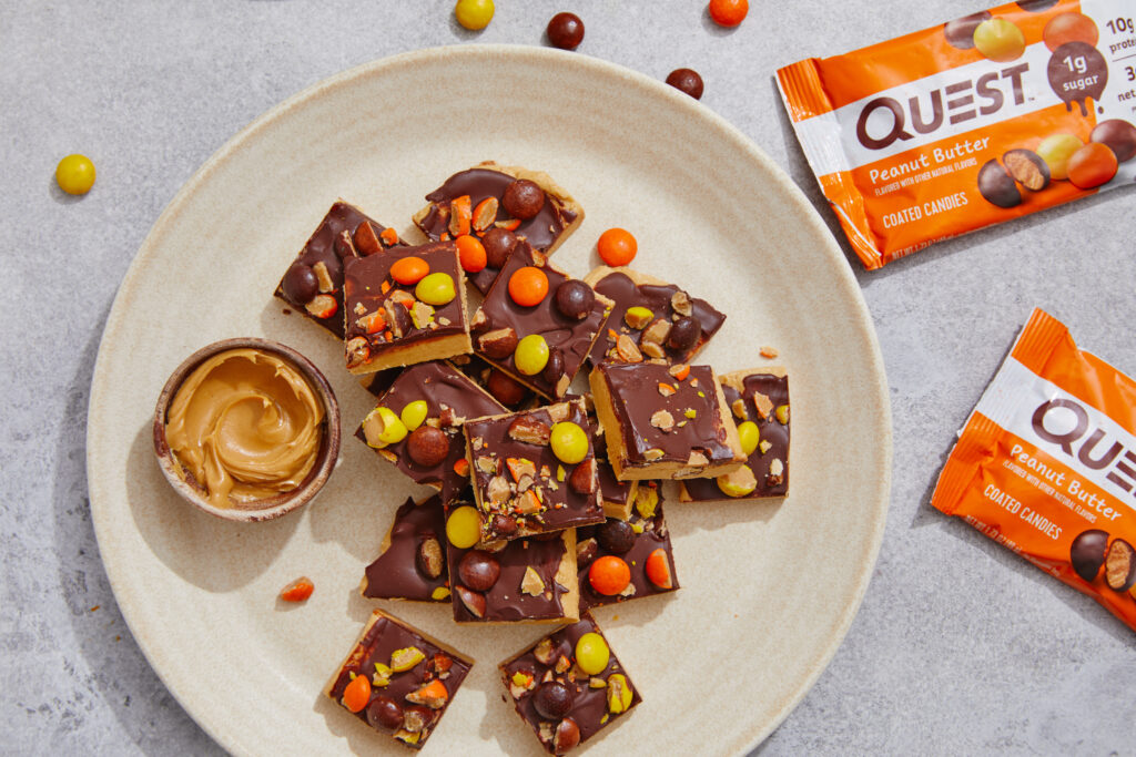 Betrügen Sie Schokoriegel mit umstrittenen, mit Erdnussbutter überzogenen Schokoriegeln. Überspringen Sie dieses Halloween die im Laden gekauften Zuckerbomben und beschwören Sie diese aus Ihrem Küchenkessel. Erdnussbutter, Kokosmehl und Quest Vanille-Milchshake-Proteinpulver vereinen sich, um einen Genuss zu zaubern, der so unheimlich lecker ist, als wäre dunkle Magie am Werk. Mit geschmolzener, zuckerfreier Schokolade und gehackten, mit Erdnussbutter überzogenen Bonbons von Quest gekrönt, enthalten diese unheimlich guten Riegel das Protein, das Sie brauchen, um mit allen Zombies und Kobolden fertig zu werden, die Ihnen in den Weg kommen – ohne sich von einem zuckerhaltigen Albtraum erschrecken zu lassen.