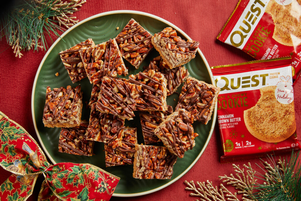 Betrügen Sie einen gewöhnlichen Kuchen mit fragwürdigen Pekannusskuchenriegeln aus brauner Butter und Schokolade. Seien wir ehrlich: Kuchen sind pflegeintensiv. Vom Rollen über das Kneten bis hin zum allgegenwärtigen Risiko, dass der Boden durchnässt wird – Kuchen sind echte Diven. Hier kommen die Questified Brown Butter Chocolate Pecan Pie Bars ins Spiel. Sie haben die ganze nussige, buttrige Magie Ihrer Lieblings-Pekannusstorte. Plus Protein. Das perfekte Urlaubsrezept für alle, die ihre Makros ohne die Extraportion Drama erreichen wollen.