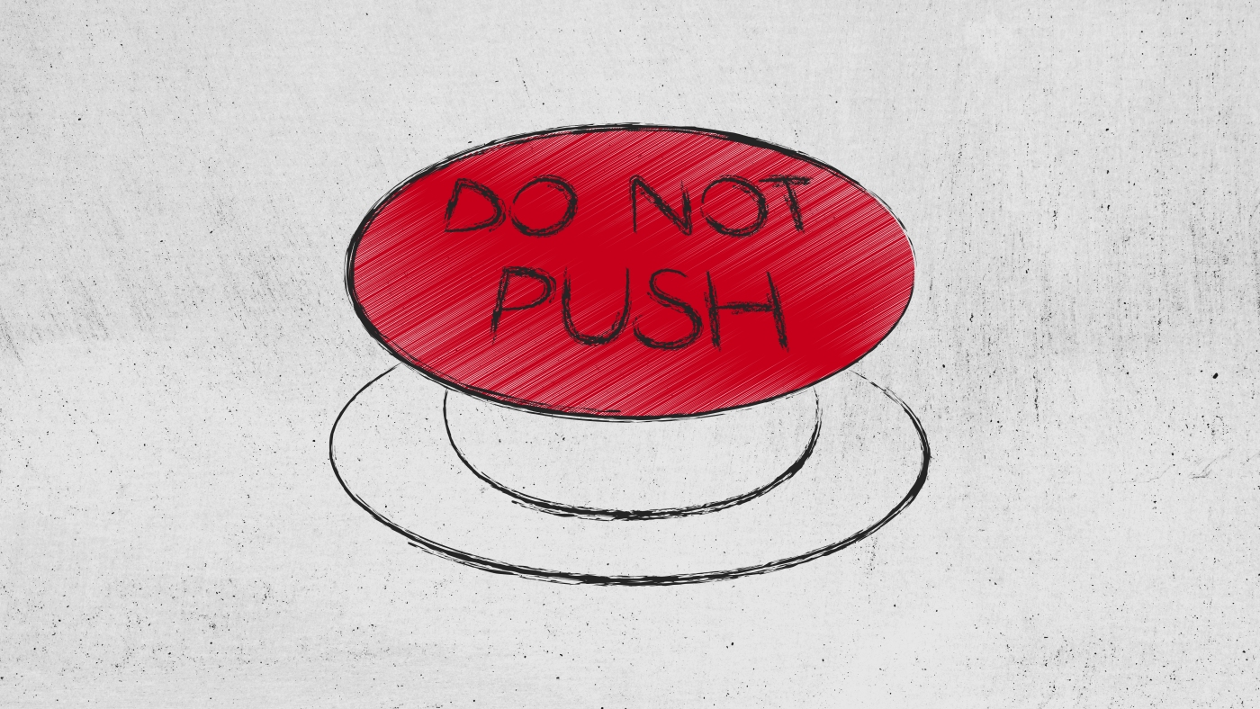 Diese Abbildung zeigt einen großen roten Knopf mit der Aufschrift "NICHT DRÜCKEN" in Großbuchstaben drauf.