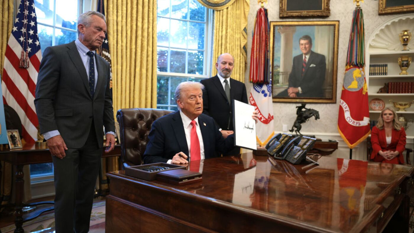 Präsident Trump, zusammen mit dem Sekretär für Gesundheits- und Humandienstleistungen, Robert F. Kennedy Jr. (hyperlinks) und dem Handelsminister Howard Lutnick (rechts), unterzeichnet am 25. Februar eine Government Order über die Preistransparenzanforderungen für die Gesundheitsbranche.