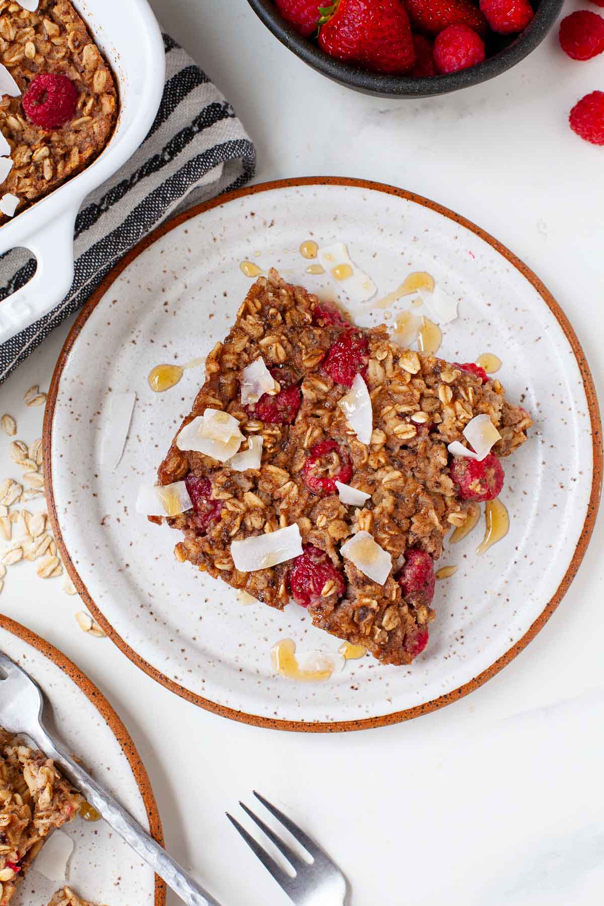 Vegane gebackene Haferflocken mit Himbeeren und Kokosflocken auf einem weiß gesprenkelten Teller neben einer Auflaufform und einer Schüssel mit BeerenVegane gebackene Haferflocken mit Himbeeren und Kokosflocken auf einem weiß gesprenkelten Teller neben einer Auflaufform und einer Schüssel mit Beeren