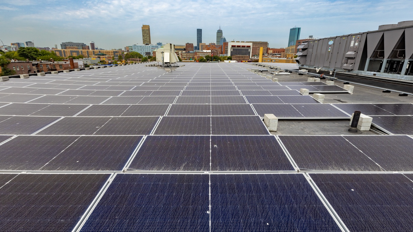 Die Solaranlage auf dem Dach des Verwaltungsgebäudes des Boston Medical Center liefert Strom für das Gebäude sowie Gutschriften, die in das Clean Power Prescription-Programm einfließen.