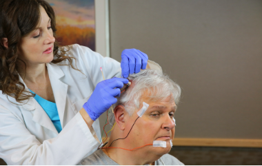 Zu Beginn des Eingriffs befestigt der Techniker Drähte mit Spezialkleber an Kopf, Kinn, Brust und Beinen. Außerdem werden Sie weiche Bänder an Brust und Bauch tragen und an Ihrem Finger ein Sauerstoffmessgerät. Einige Zentren verwenden möglicherweise ein Mikrofon zur Messung des Schnarchens und verfügen über zusätzliche Audio-/Videoaufzeichnungsgeräte.